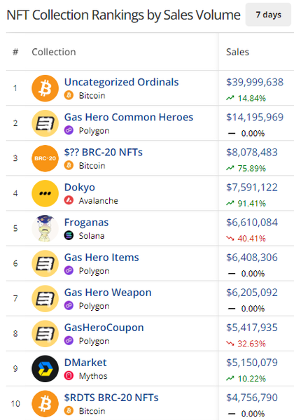 - Gas Hero on Polygon is dominating the Top Ten Collection Rankins with 4 collections in the top ten. Together the collections have sold for over $32.22m on the Polygon