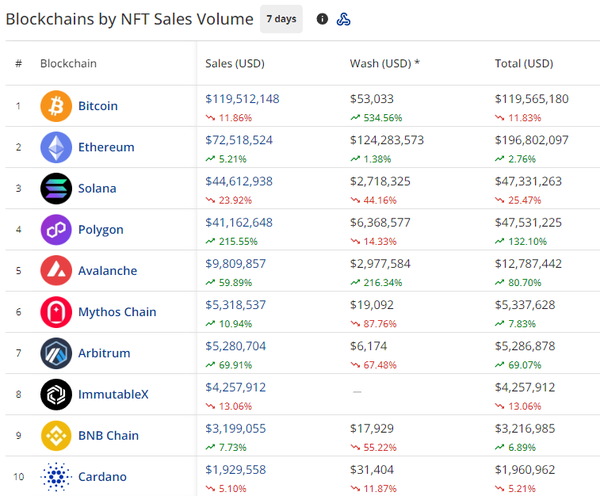 past week Bitcoin has seen over $119.51m in NFT sales, and surprisingly has over $53k in wash sales.