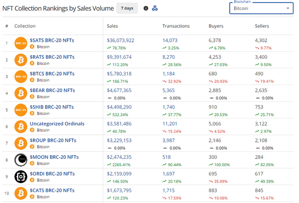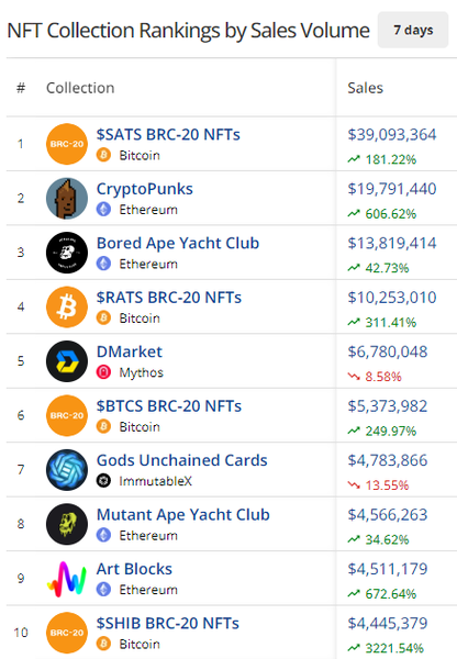 - The $SATS BRC-20 NFT collection was the top-performing NFT collection this week, beating CryptoPunks and