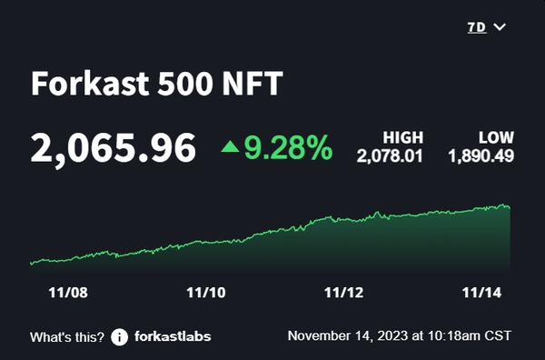 What a week for the NFT market. The Forkast 500 NFT Index is reflecting a massive increase in the value of the NFT market over the past seven days, up to 2,065.96, a whopping 9.28% gain from last week. NFTs value continues to climb as true collectors are back to collecting iconic