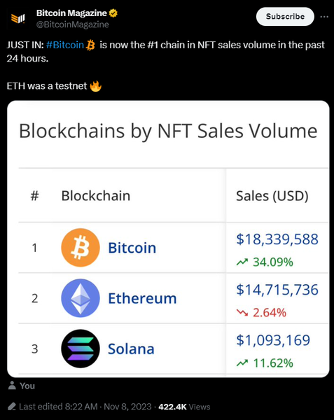 Flippening finally happened last week. I’m talking about the Bitcoin collectible ecosystem flipping Ethereum’s NFTs for the first time ever. And just yesterday, it happened again when Bitcoin saw $17.2m in sales volume, a 30% lead over Ethereum’s $11.97m.