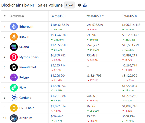 - Bitcoin again was a monster in the past 7 days, flipping Ethereum’s ecosystem twice in daily NFT sales. On top of sales being up 253.79%, buyers