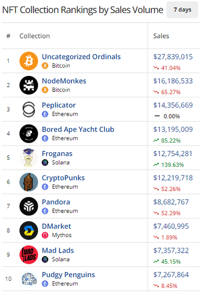 - Bitcoin was one of the biggest losers this week with sales falling 40.92%. Again, it’s $BTC’s new ATH that caused a pause in ordinals trading, and it’s fair to