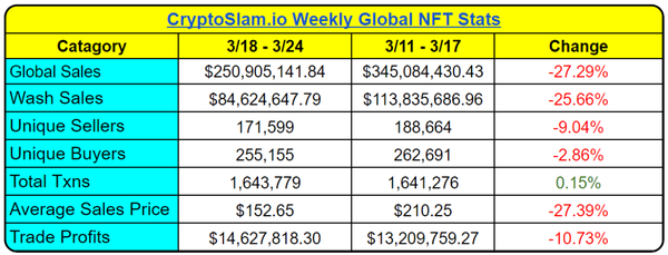 Buyers fell just --2.86 % in the past week, and compared to the -16.52% decline we saw the week before, it’s clear that many traders sensed an opportunity in the discounted NFT market. Where we really see the impact of last week’s losses is when we look at global NFT sales, along with the average sale price of NFTs, with both falling drastically. Even with more total transactions than the prior week, sales fell -27.29%, nearly matching the -27.39% decline in average sale price.
