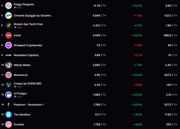 - Pudgy Penguins saw their prices collapse last week to 10 ETH, but that was followed by an incredible rebound as their floor price hit as high as 16 ETH. Now they and