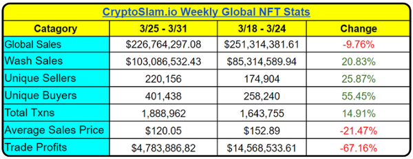 saw above, Solana last month saw over $58B in DeFi volume. Compared to what we’re seeing in the NFT market, you could almost argue that NFTs are once again dead with just $226.76M in sales. It wasn’t all bad news in NFTs last week though, as sellers, buyers, and transactions were all well up. The patterns