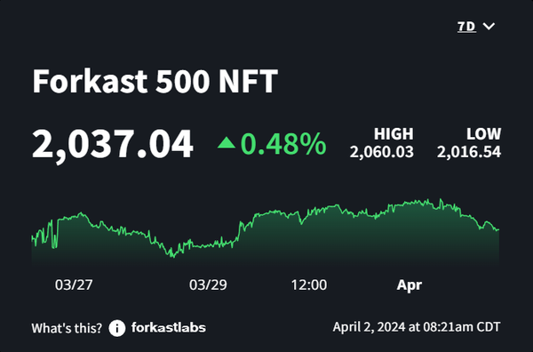 The Forkast 500 NFT Index reflects that the NFT market is up 0.48% in the past 7d. But how can that be with most of the crypto market down 5-10% in the past week, and floor prices are tumbling again right along with it?