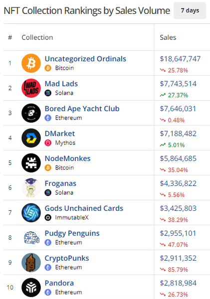 - Mad Lads are soaring with $7.7M in sales and is the only top ten PFP NFT collection to see their sales volume increase this week thanks to their steady stream of token