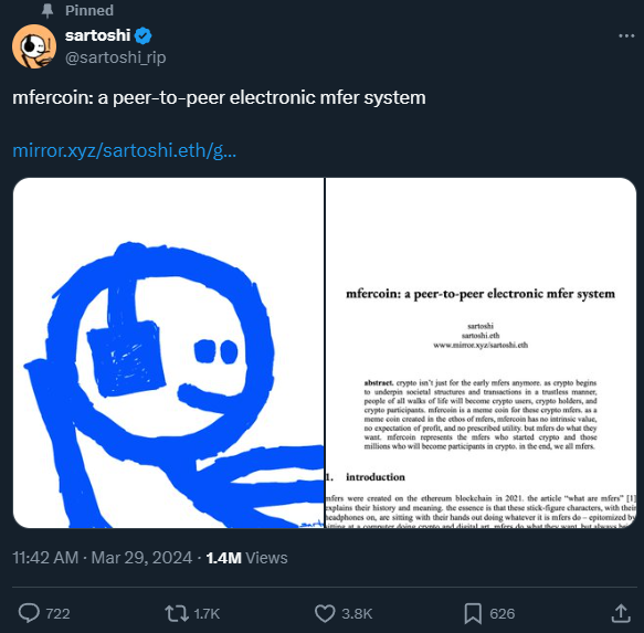 - MFER’s aren’t just an OG CC0 collection, but they’re also just as cool as ever, evidenced by their plunge into the token meta. MFER founder Sartoshi stealth launched a new