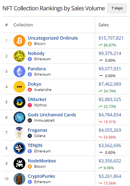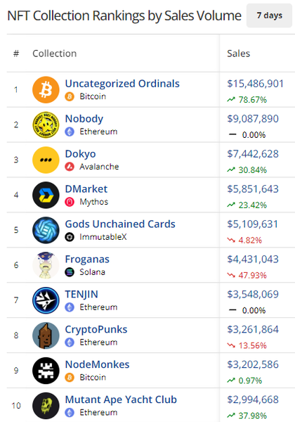 like Nobody and TENJIN. Sales were up 29.13% in the past seven days, with sales climbing to $83.43m.