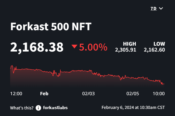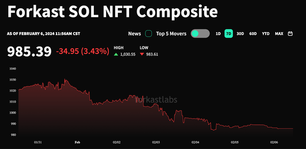 After a big green week for the NFT market, the Forkast 500 NFT Index now reflects a massive 5% loss in the past seven days. Crypto prices are largely down over this period, and NFT sales volume, while up, isn’t seeing the top NFT collections find higher floor prices to counter the devaluation from crypto. While we’re waiting for the $JUP liquidity infusion to work its way into the NFT market, a giant roadblock may have been hit just today with the major Solana outage. Will traders be thinking twice about collecting NFTs on Solana?