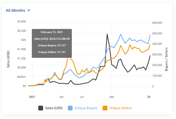 - Doodles are in the midst of an epic comeback story, with sales up 79.86% to $4.61m. Traders are sweeping grails on a daily basis as hype builds around the brand’s unique