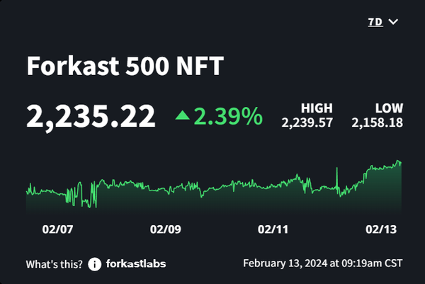 We don’t usually want to see red in the markets, but thanks to crypto’s red-hot week, the NFT market is back in the green. The value of NFTs has climbed 2.39%, with Ethereum’s 4.9% increase, Solana’s 4.49% gain, and Cardano’s 1.4% upswing leading the way. Polygon is the lone ecosystem in the red this week, losing 1.59% of