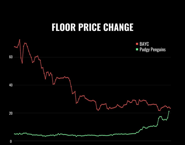 - Pudgy Penguins are flying once again, this week threatening to flip the Bored Ape Yacht Club’s floor price. Sales are up 157% while their average sale price has climbed to a high of