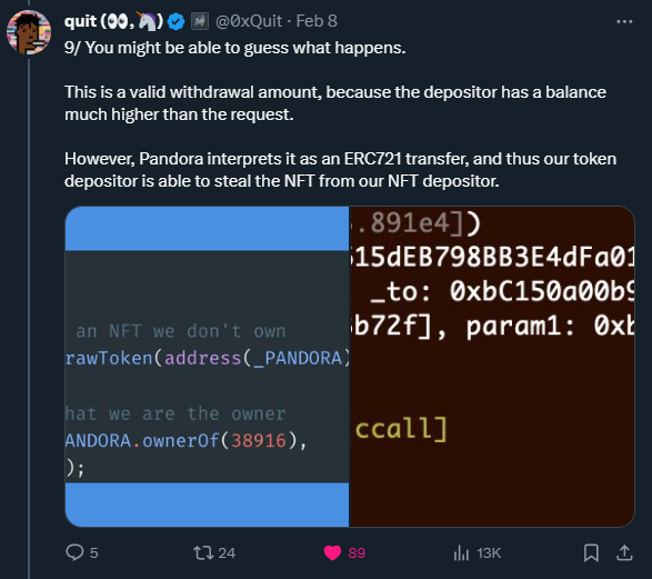 0xQuit, audited the ERC404 and found a significant issue that can lead to your NFT being stolen. As it turns out, the ERC404 is not an officially recognized token standard that went through Ethereum’s EIP process. Instead, the team behind the standard said, “Official stamp of approval be damned, we’re innovating”. That may have been a mistake.
