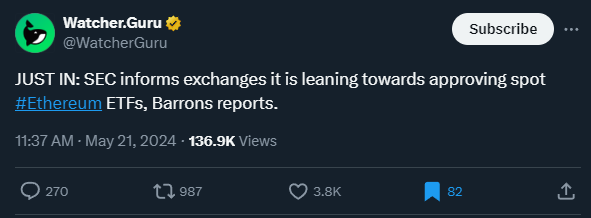 likely to approve Ethereum NFTs this week, which is a major about-face considering $ETH was declared (in private) a security in March. What is happening may be a direct reaction to Donald Trump announcing he would embrace crypto, because until now, the current administration has signaled the exact opposite. An Ethereum ETF approval would signal, potentially, the current administration changing its stance on crypto in the short term.