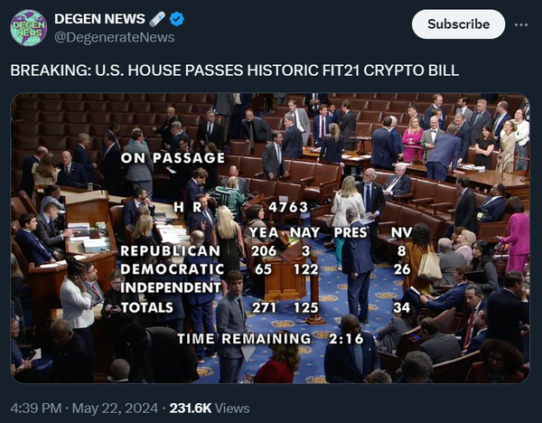 Last week the US House passed FIT21, which aims to shift some crypto regulation from the SEC to the CFTC, and then the SEC did a surprising 180 on Ethereum ETFs, taking the first steps towards approval.