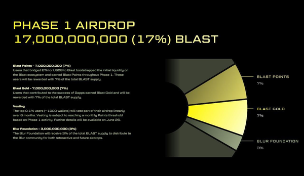 Pacman, the founder of Blur and Blast, revealed that 17% of the $Blast supply will be distributed in the phase 1 airdrop tomorrow. 7% goes to Blast Points, 7% to Blast Gold, and 3% goes to the Blur Foundation.