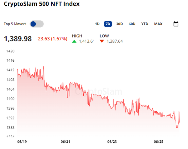 The Cryptoslam 500 NFT Index shows what we’ve felt in the NFT community for the past week - steady declines. The index fell -1.67% to 1,389.98, a fresh new low for the year. Crypto is in a tricky spot with major uncertainty in the market thanks to Germany liquidating hundreds of bitcoin, and now news that Mt Gox will be returning potentially $9B worth of stolen bitcoin to creditors.