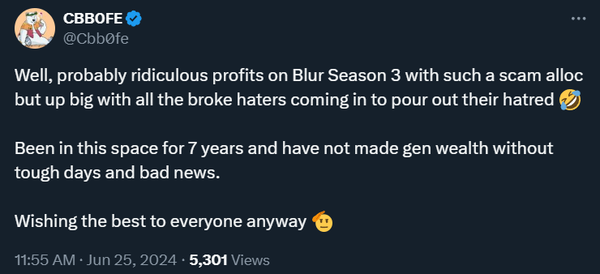Blur farmers got wrecked here, with .5% going to Blur traders and .5% going to Blur stakers, but Blur stakers get a bonus of 1% that they can claim tomorrow. The remaining 1% is held for Blur season 4 and future use, but there may be few traders left to participate in the new season. TLDR, Blur farmers are getting very