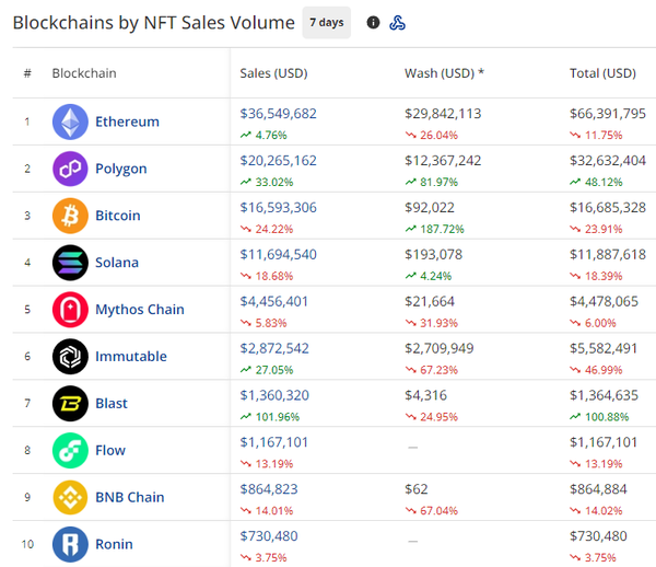 - Bitcoin drops to the #3 spot this week with volume in ordinals drying up. Sales fell 24.22% to $16.59M while collection floor prices fell to multi-month