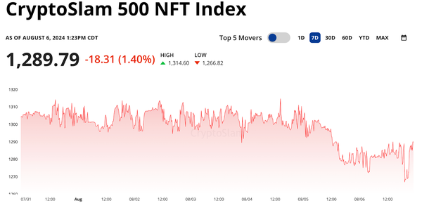 The CryptoSlam 500 NFT Index fell another -1.4% this week as crypto prices are down and NFT volume slows. The world is on edge right now as war looms in the Middle East, and the US economy waits for rate cuts to help settle recession fears. NFTs