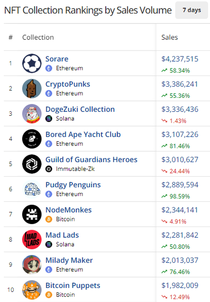 - Sorare soared to the top of the collection rankings on the very same week that DraftKings shut down their own fantasy NFT project. Sorare’s fantasy sports collectibles saw $4.2M in sales while