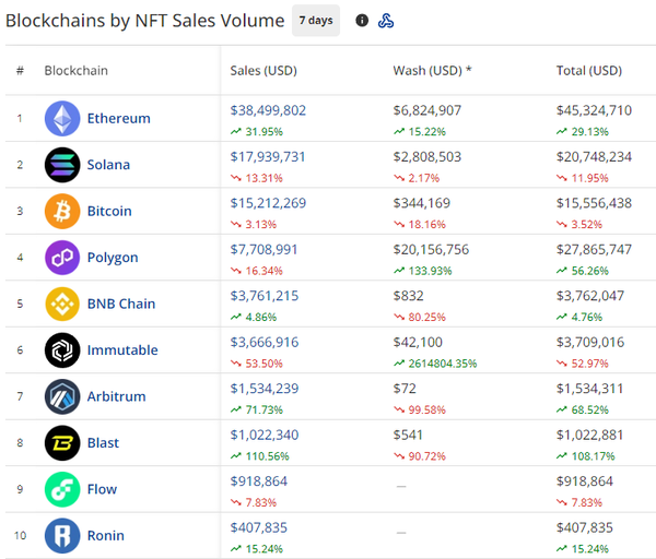 - Ethereum has now been the king of NFTs for 2 months straight, with sales now climbing 31% to $38.4M.