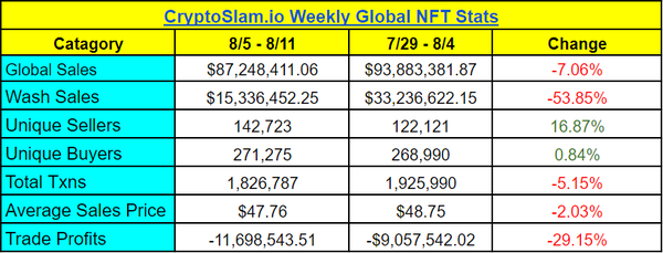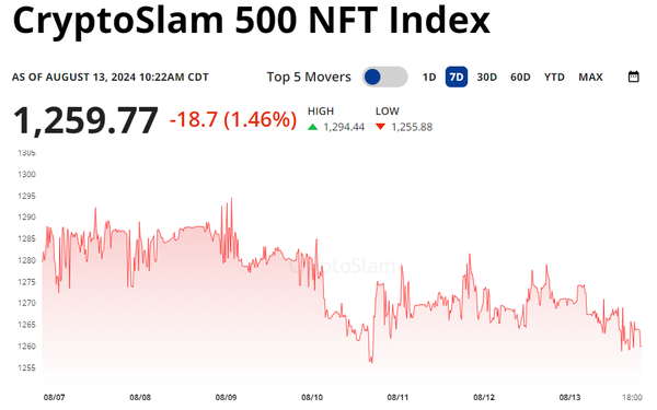 The CryptoSlam 500 NFT Index is almost a mirror image of last week on its way to another -1.46% decline. Crypto has found some stability but NFTs have been steadily losing value as volume dries up this summer. The thesis remains the same, we