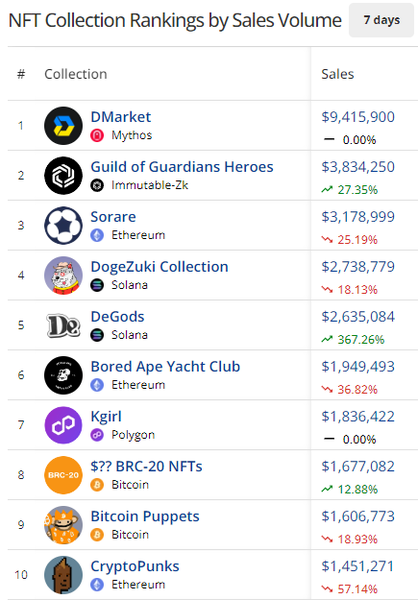 - DMarket is the king of NFTs this week with a whopping $9.4M in NFT sales. Over 27k unique buyers collected gaming skins from CounterStrike, DOTA2, Rust and other AAA non-crypto games on the Mythos
