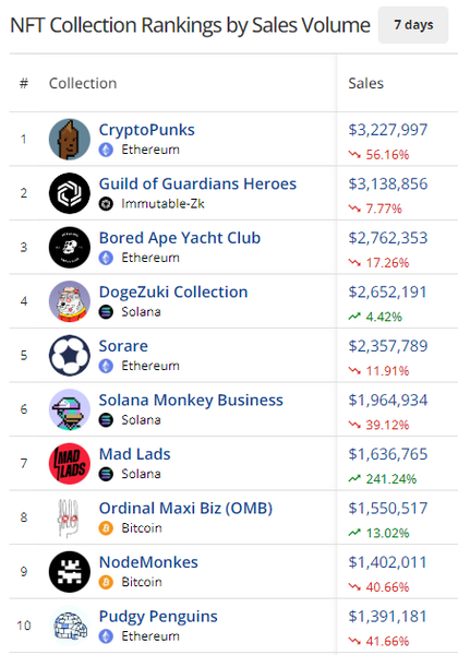- Mad Lads had the best performance of any top-ten collection this week, with sales increasing 241.24% to $1.63M. Lots of new eyes were on the collection after they created a profile picture for