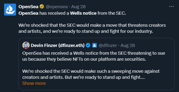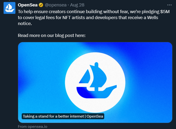Back to the SEC, who would love nothing more than to cripple NFTs, it feels like they’re about to make their biggest push against NFTs yet. OpenSea announced they’ve received a Wells notice from the SEC and the notice indicates that OpenSea has been selling NFTs they claim are securities. The community is now debating what NFTs are in the SEC’s crosshairs. Is it art and collectibles, or is it token-yielding NFTs? OpenSea plans to fight any changes brought by the SEC and is pledging $5M for creators who are also charged.