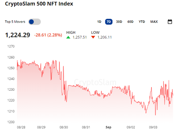 The CryptoSlam 500 NFT Index fell -2.28% in the past 7d while crypto trades sideways and NFT traders focus on new mints. That’s right, it’s not that traders are entirely away from NFTs (even though many are at Korea Blockchain Week this week),