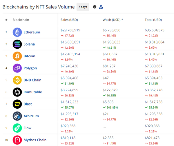 - Ethereum saw $29.76M in NFT sales this past week, more than both Solana and Bitcoin combined. Buyers