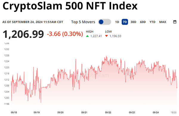 The CryptoSlam 500 NFT Index fell -0.30% in the past 7d after spending most of the week in the green. Rate cuts have kept the NFT value stable, if not up, and the index certainly is reflecting that stability. Remember, sales volume isn’t the