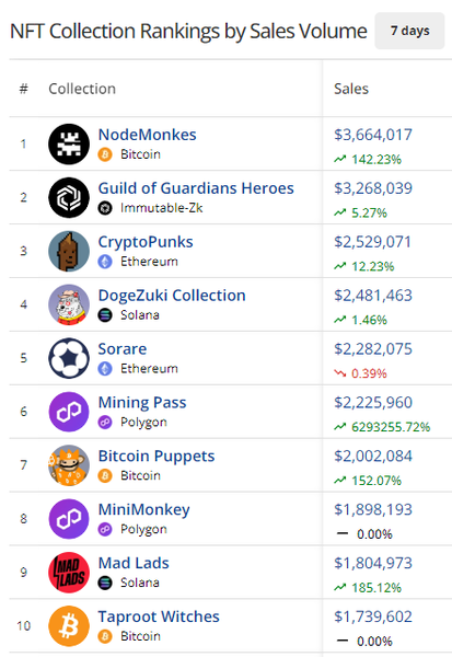- NodeMonkes are on fire along with the rest of the ordinal ecosystem. Sales are up over 142% with buyers up 73%, and a floor price now at .2 BTC