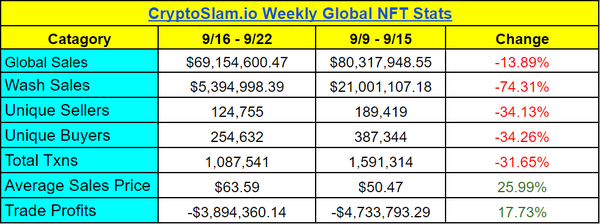 Diving into the weekly numbers, and it becomes clear just how drastically NFTs fell last week. Almost across the board, we saw numbers decline, reflecting that traders are stepping away from the market.