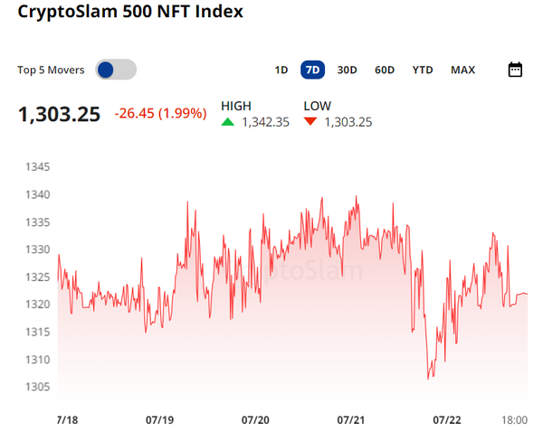 The NFT market finds itself in another down week, as the CryptoSlam 500 NFT Index has lost another -1.99% in the past 7d. YTD the index is now down -47.28%, highlighting how this bull market has so far mostly been outside of