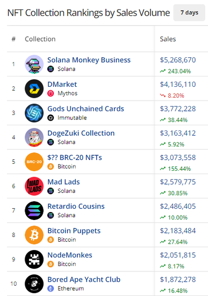 - SMB is the big winner of the week, as the OG Solana NFT collection rocketed up the leaderboard this week. Sales were up 243.04% to $5.26M while buyers soared