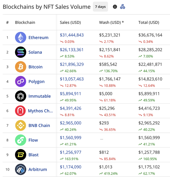 - Bitcoin was the biggest gainer of the top 5 blockchains this week and saw sales climb 49.95%. With a mix of OG collections and new mints both finding success, Bitcoin season may just be