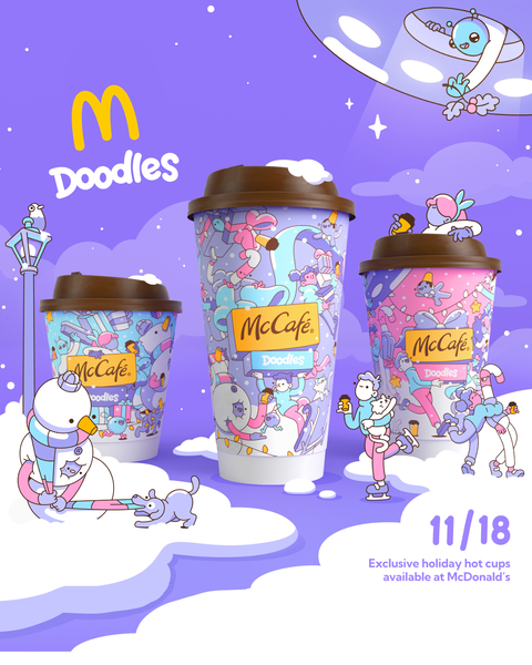 - The biggest partnership in NFT history? Yes. Yesterday, The Doodles and McDonalds officially released their new collaboration, which includes Doodles art on McDonald’s coffee cups at every store through the end of the year (100 million cups!), physical merch, and digital wearables for Doodles avatars. McDonald’s X account even posted the partnership, while changing their banner to Doodles art, and featured the