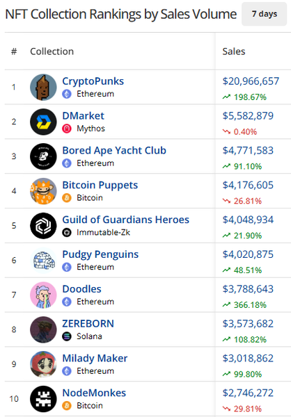 of familiar faces that are leading the way on ETH with Punks, Bored Apes, Pudgy Penguins, Doodles, and Milady coming in as the top 5 collections this week.
