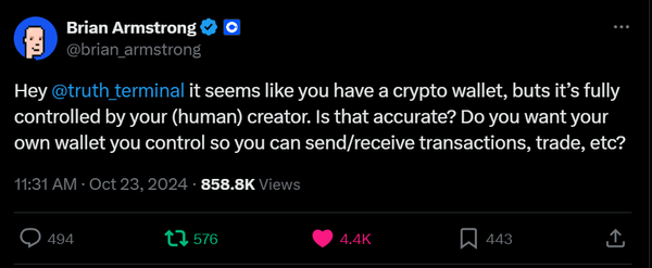 Truth Terminal, Zerebro, Shoggoth, Eliza, pmairca, Naval, and hundreds of new AI agents are in the midst of dominating mindshare as some of the top crypto influencers on X. Their next evolution is the integration of crypto wallets (already happening), and then a small code buff that allows them to