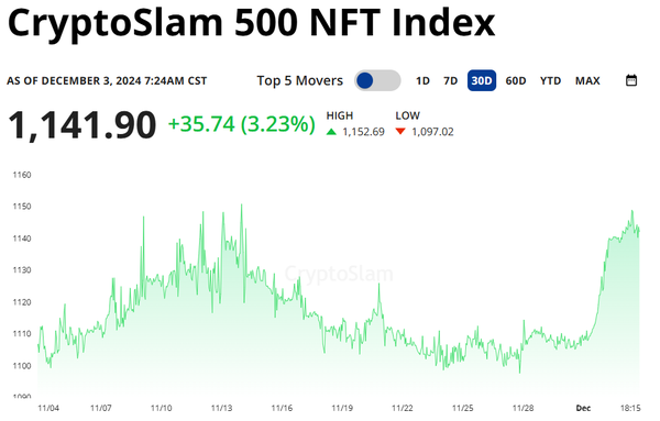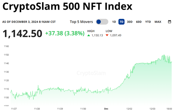 The CryptoSlam 500 NFT Index is up +3.38% in the past 7d reflecting exactly what you’re feeling in the market--it’s up big. Ethereum’s ecosystem is the biggest winner, up +25.09%, while Solana is up +2.27%, Polygon +3.51%, and Cardano up a surprising +5.58%.