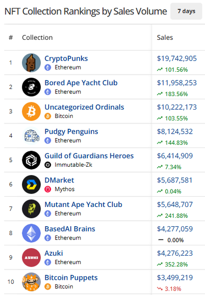 - Ordinals, like their NFT counterparts on ETH and SOL have seen major action over the past week. Sales are up +103.55% to $10.22m with collections like Bitcoin Puppets, NodeMonkes, OMB, and Quantum Cats finding floors at .158 BTC ($15k), .13 BTC ($12.3k), .132 BTC ($12.4k) and .191 BTC ($18.1K)