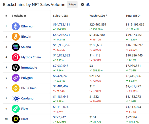 - Ethereum is still the top blockchain by sales volume, this week registering $94.73m in sales. Buyers are