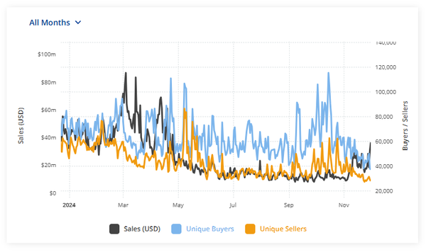 November sellers, buyers, and transactions are all well below October’s levels (our 2nd worst month for NFT sales this year).