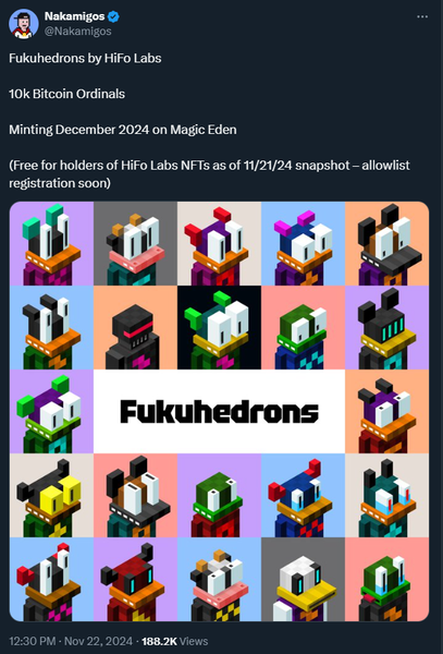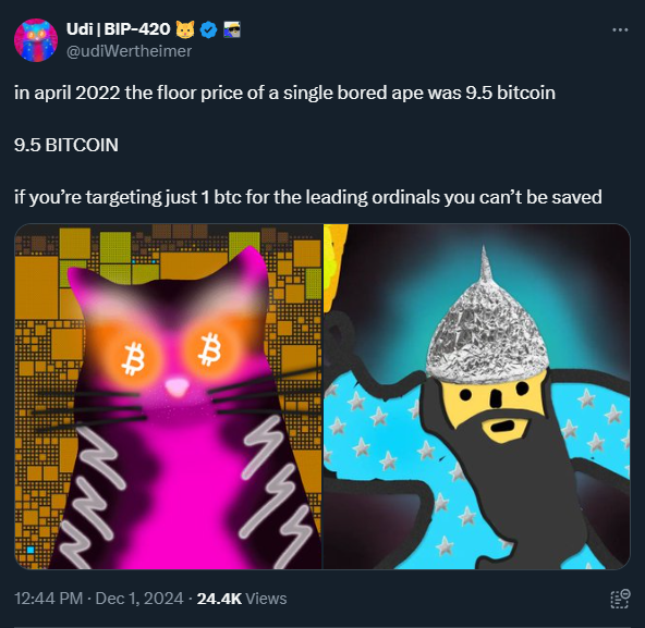 $ME’s massive token drop is next, arriving on Dec 10, with rumors that it will be worth in the $300-450m range. We’ll also see the Abstract chain token drop during this cycle, big rewards on the Sui blockchain, and likely some major drops on Berachain, Monad, and of course, OpenSea. Ahead of this, traders are predicting massive floor prices, which is driving collections like CryptoPunks to a $160k floor, Bored Apes to over $80k, and Pudgy Penguins to $51k. If you doubt we can go higher than this, remember last cycle BAYC got as high as 150 ETH (9.5 BTC or $450k). You’d be wise to not underestimate what people will spend when they think they can still find profit.