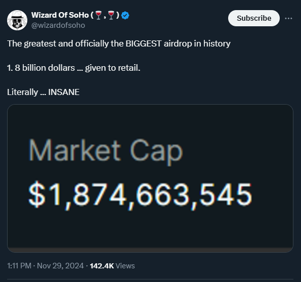 Big token drops/claims will also fuel this NFT run. Last week we saw the biggest token drop in crypto history when the trading platform HyperLiquid dropped 30% of its token supply to the community. Immediately after the drop, the value of the community allocation skyrocketed from over $600m to over $1b in rewards. Many