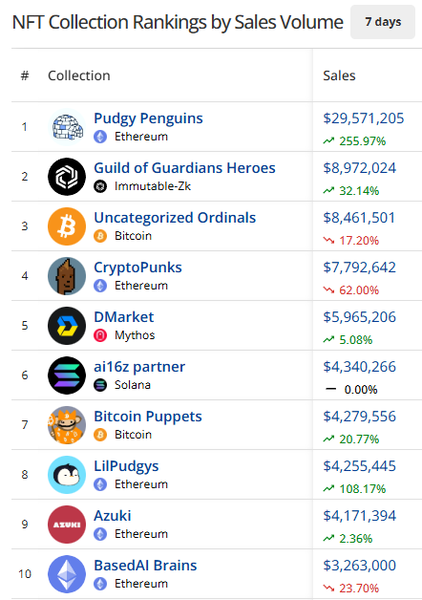 - Pudgy Penguins are on fire this week, coming in as the top NFT collection with $29.57m in sales. It’s their upcoming $PENGU token that has traders collecting in a frenzy, in a bid to get a